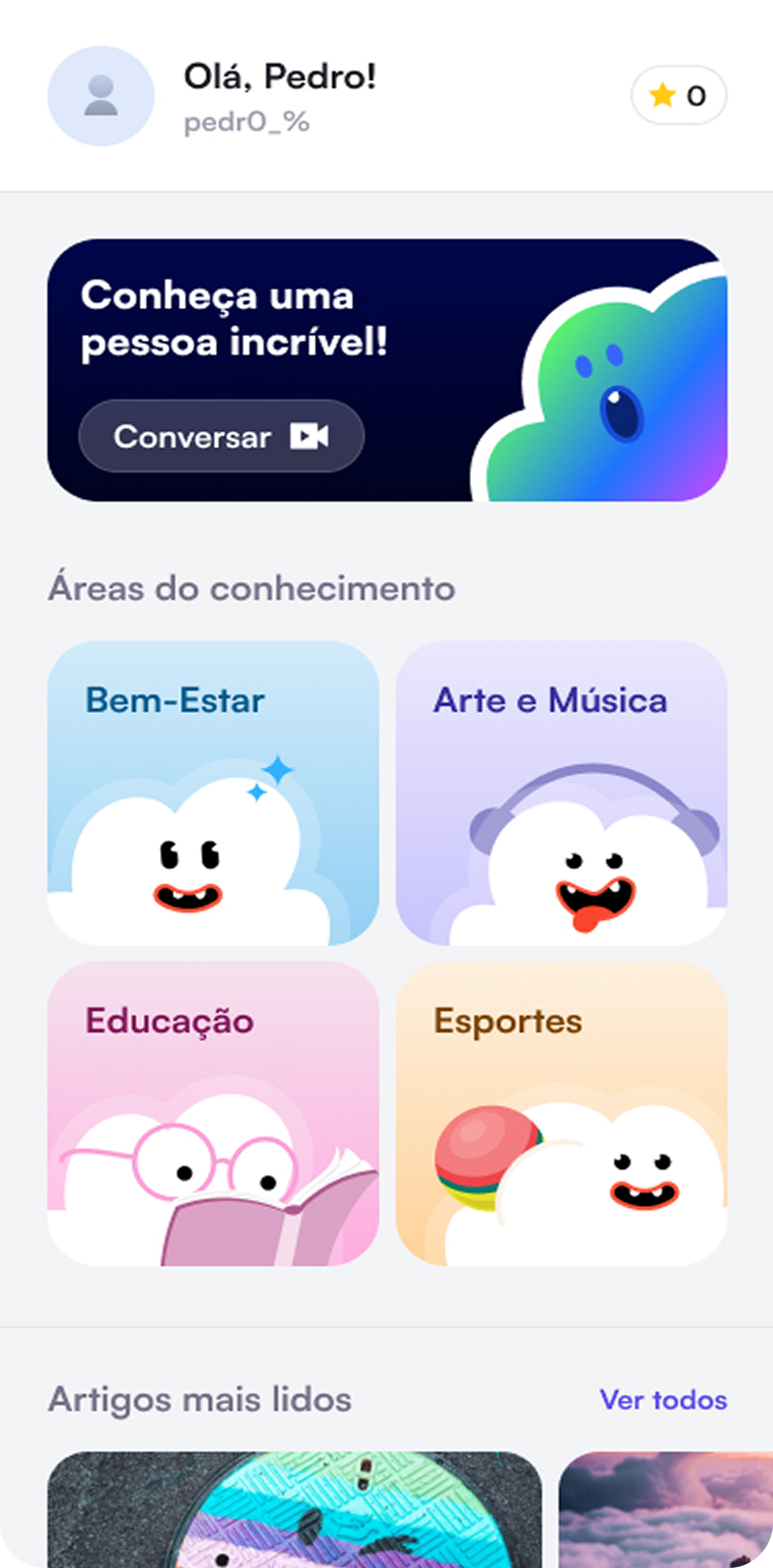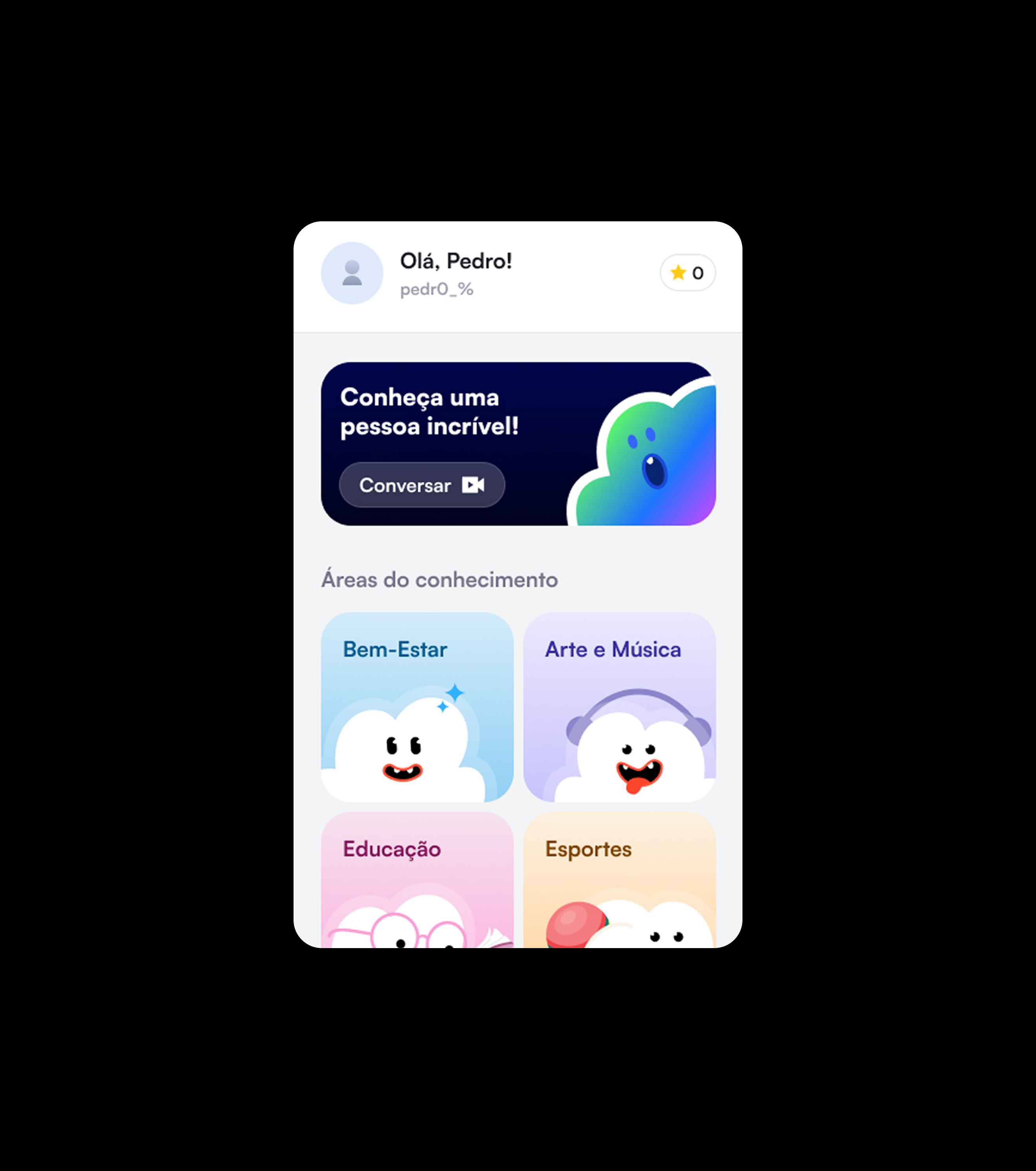 Fomos responsáveis por toda a identidade visual, ilustrações, interfaces e estrutura de gamification do aplicativo. Criamos um sistema visual fluido, com uso estratégico de cores, animações e reações que tornam a experiência mais viva e interativa. O design equilibra personalidade e clareza na navegação