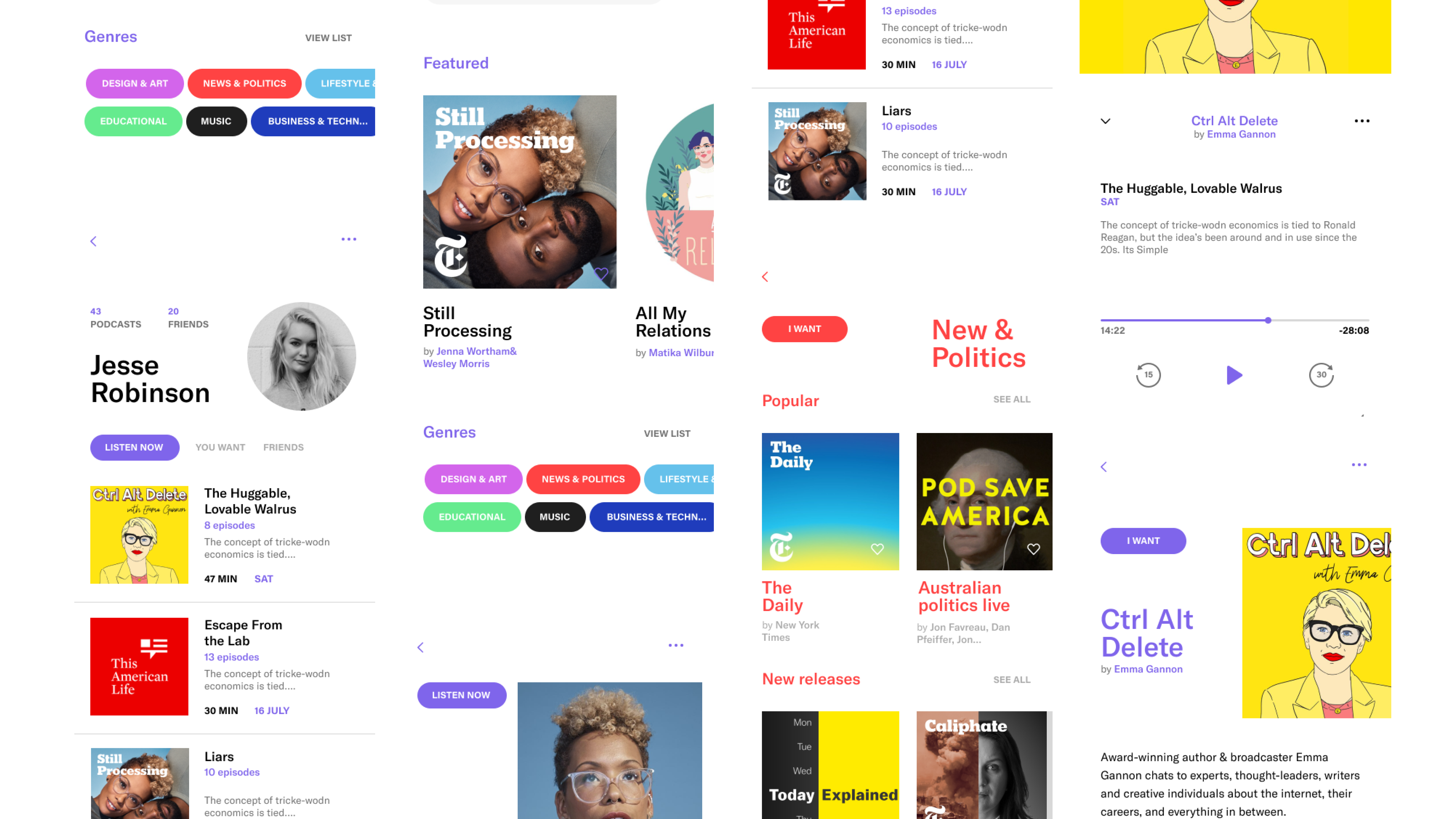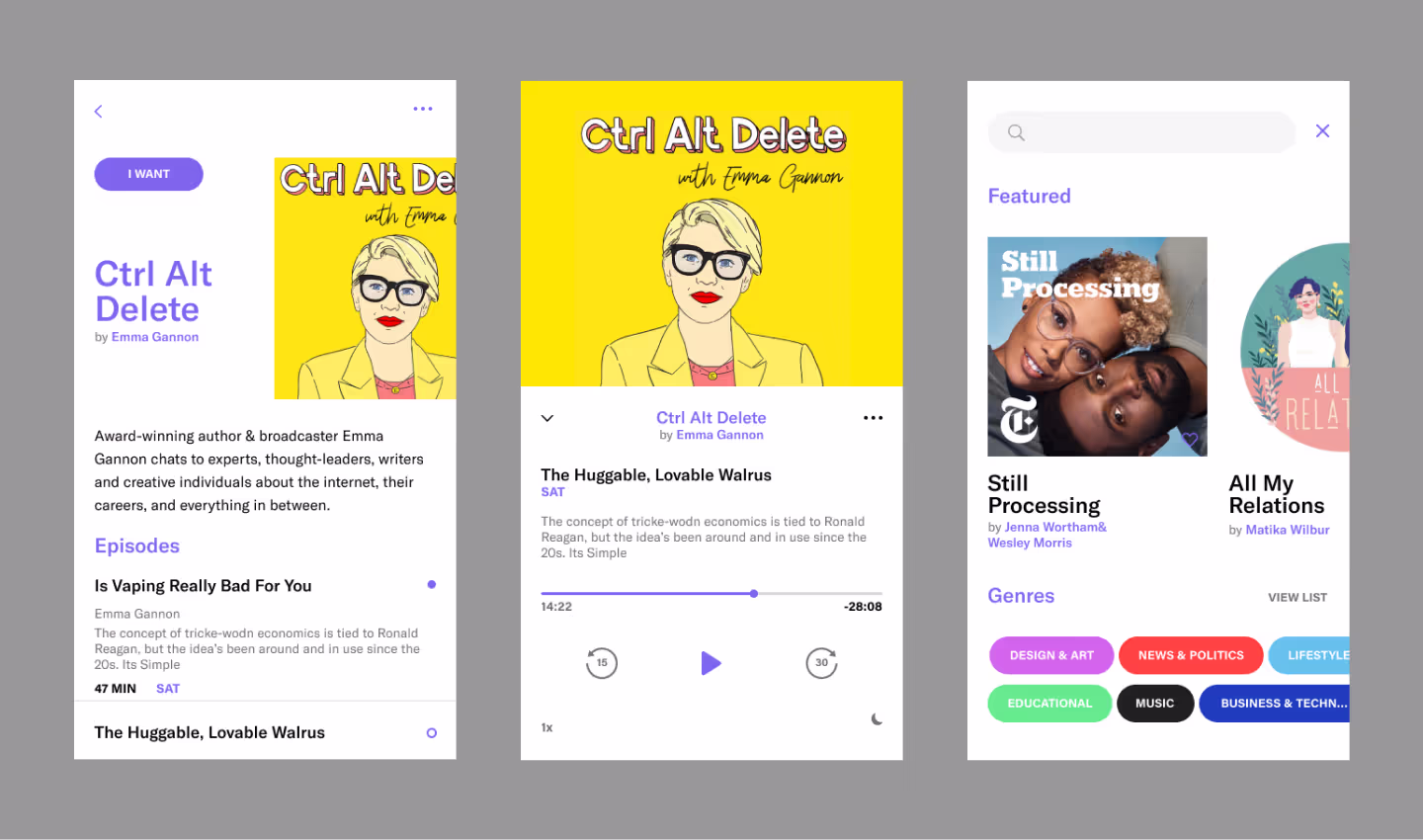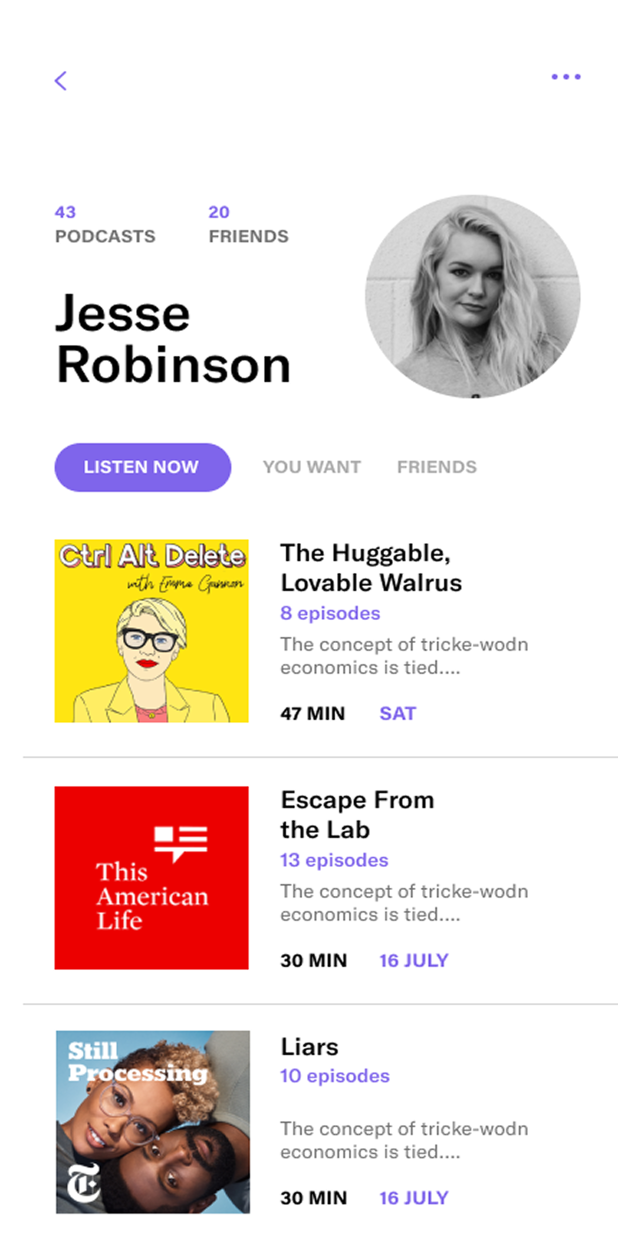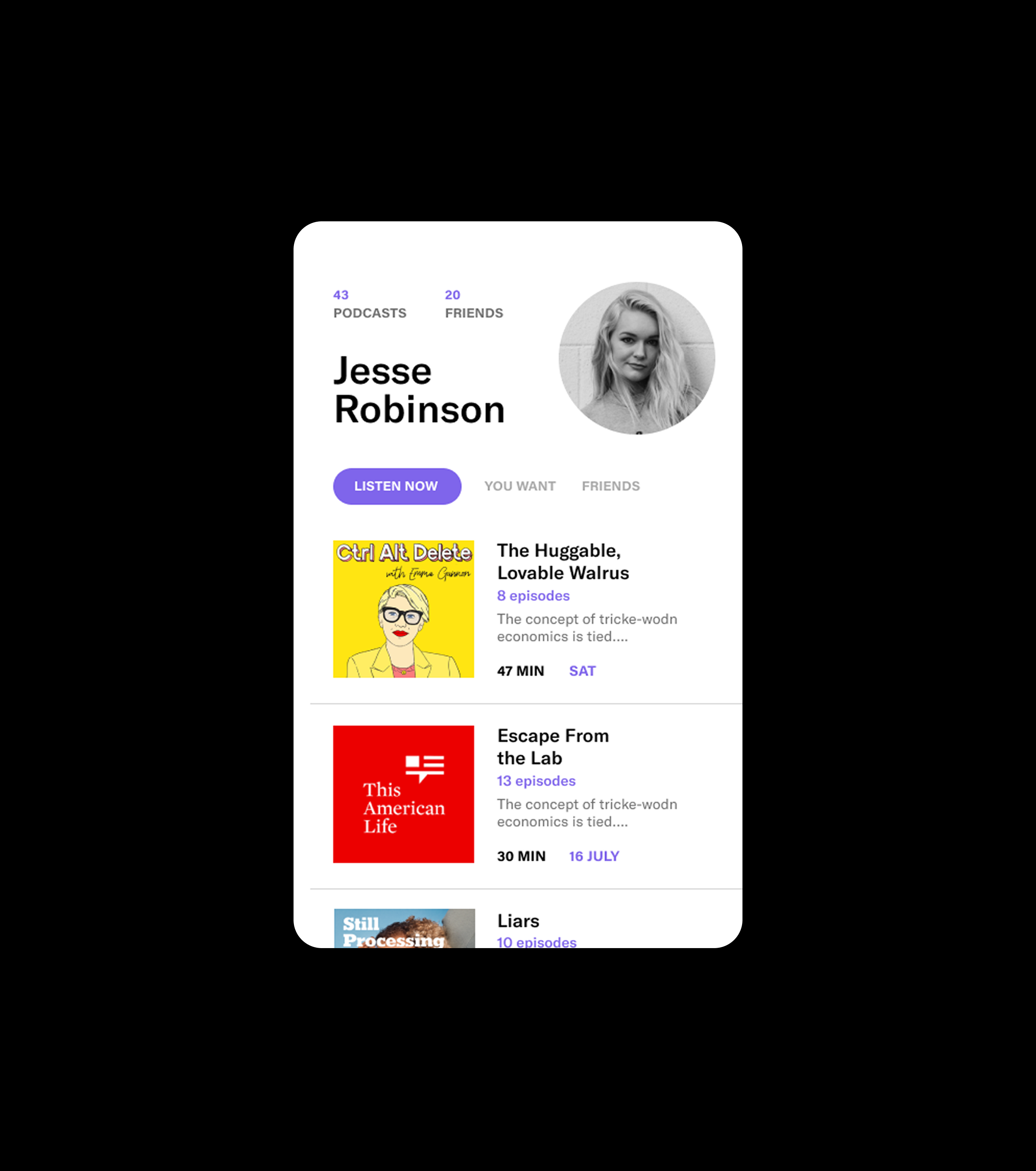 Sunday nasceu como um aplicativo para centralizar todos os podcasts que o usuário já escuta em diferentes plataformas, como Spotify e Apple Podcasts. O desafio foi criar uma experiência limpa e organizada que permitisse gerenciar conteúdos diversos em um único ambiente, sem gerar complexidade ou ruído visual. Era necessário transformar volume de informação em uma interface clara, intuitiva e com boa performance de navegação
